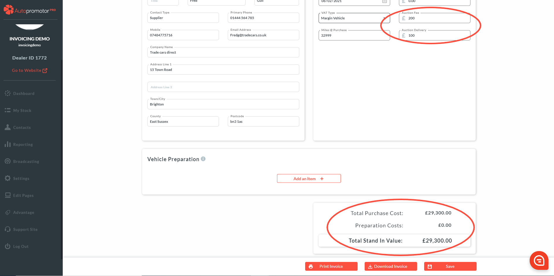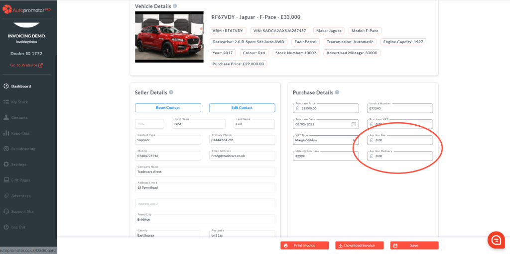 On the purchase invoice, in the ‘Purchase Details’ Box, you will see a section where you can add in Auction Details, if the vehicle was purchased from an Auction.
