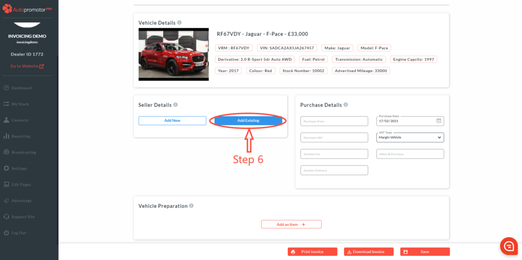 Follow this step-by-step guide to adding an existing seller against a vehicle purchase invoice