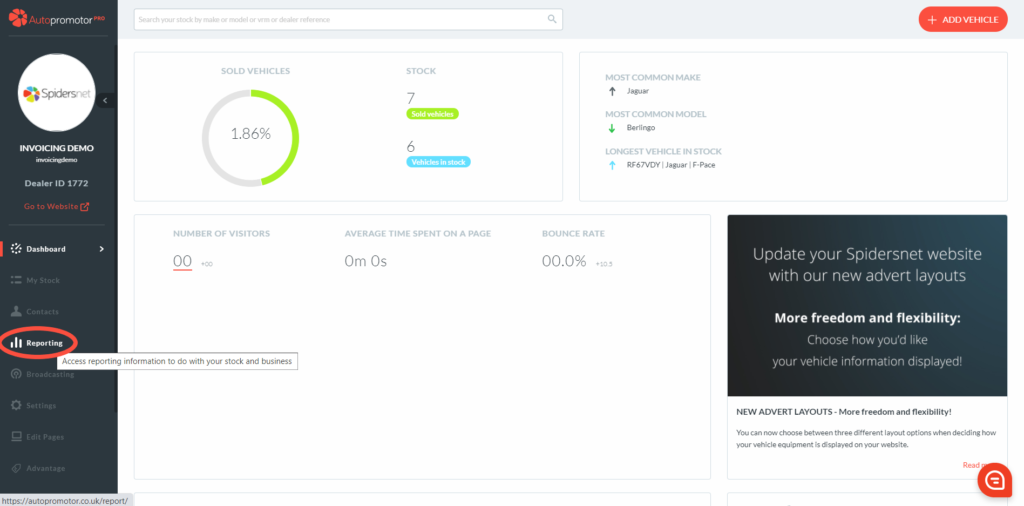 - From your Dashboard, click on ‘Reporting’ in the left hand Navigation menu