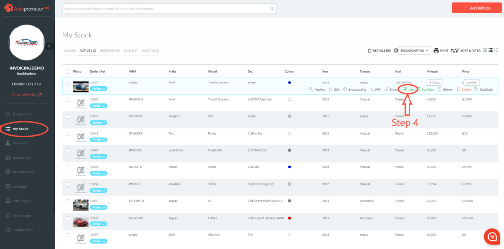- Find vehicle you want to raise a sales invoice against