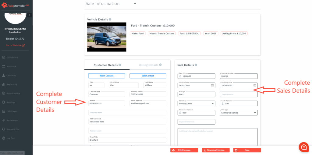 5. Complete customer details 6. Complete sales details – Commercial Vehicle should be pre-set in VAT type