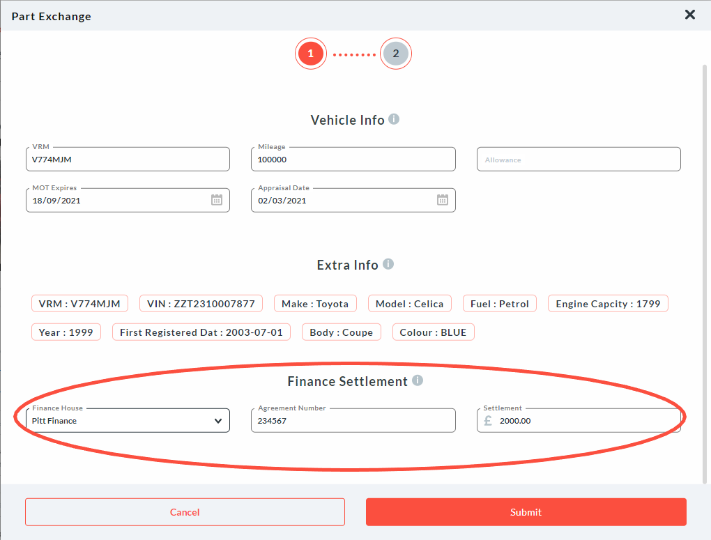 - Further details of the vehicle will be shown, including a section named ‘Finance Settlement.