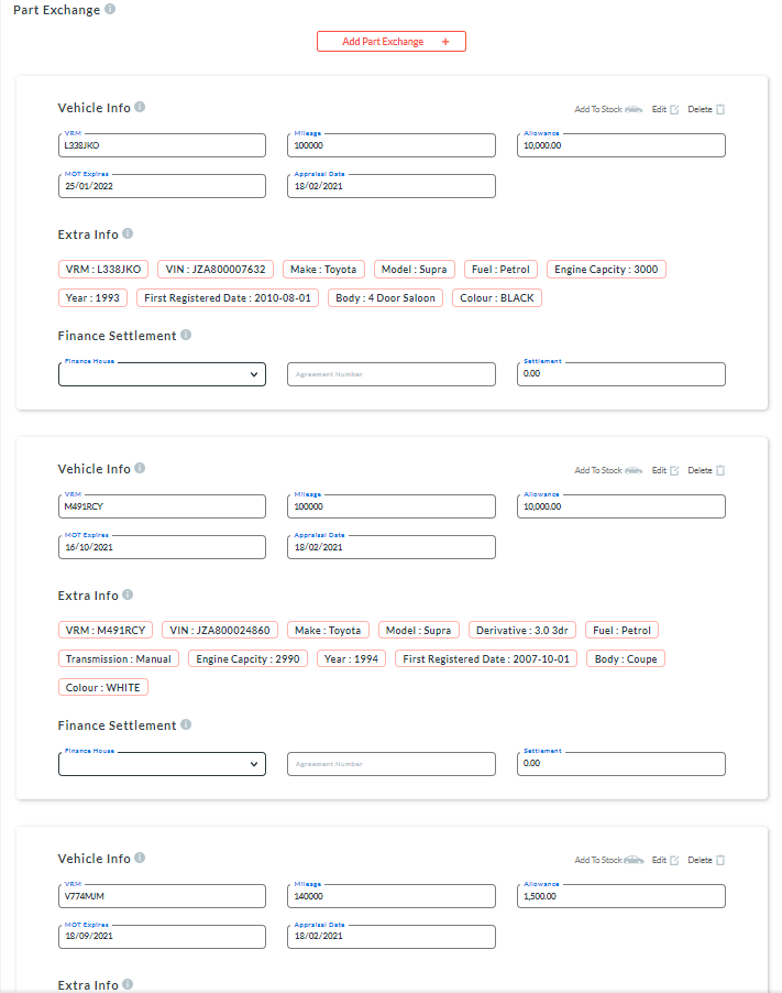 10. Repeat the same process for each part exchange vehicle a. Each part exchange vehicle will show on the sale information screen with their details. b. The sales invoice will adjust the amount left to pay for the vehicle being purchased when each part exchange vehicle is added.