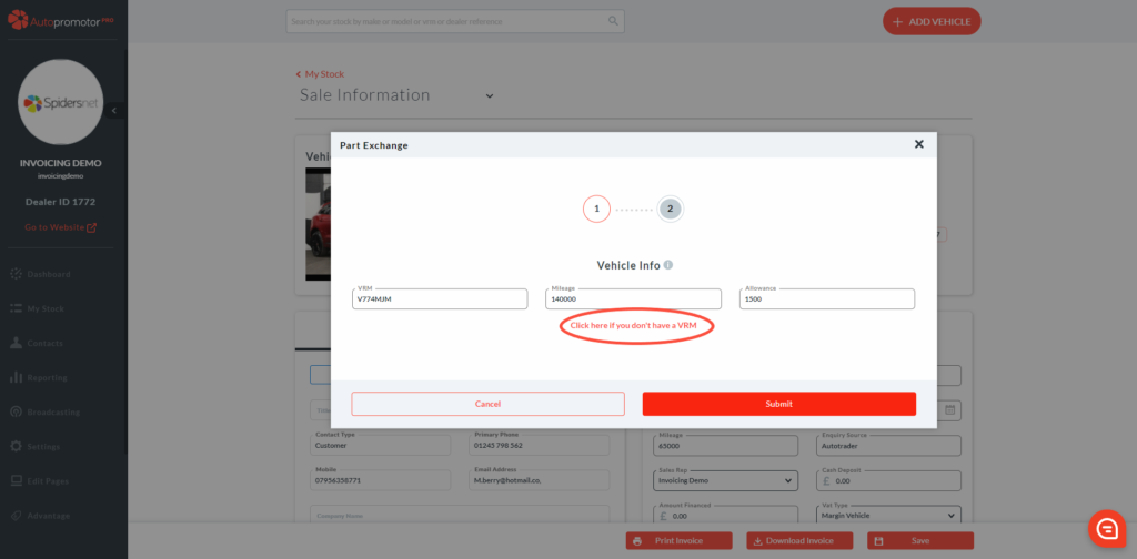 - A pop-up box will appear asking for Part Exchange vehicle details