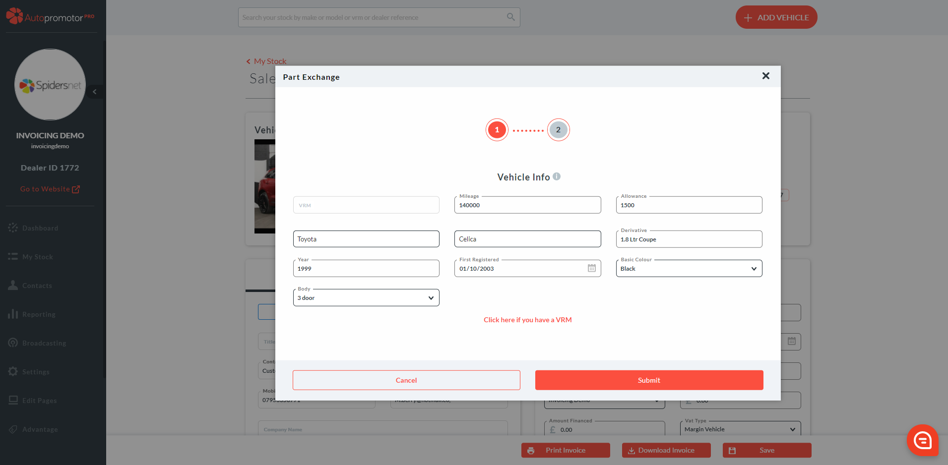 - A pop-up box will appear asking for Part Exchange vehicle details