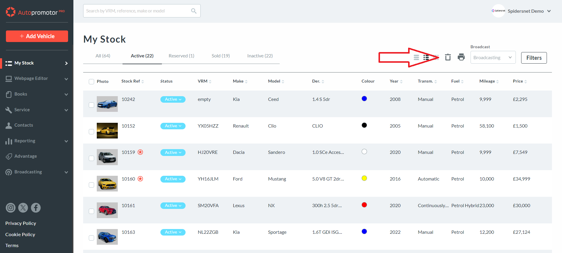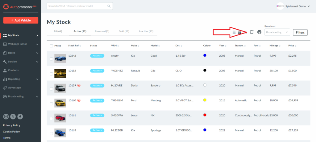 1 – Go to the ‘My Stock’ section of Autopromotor. Here you’ll be presented with a list of all of your vehicles. To delete an ad, simply click the ‘Delete’ button on the right hand side of the vehicle you wish to remove.