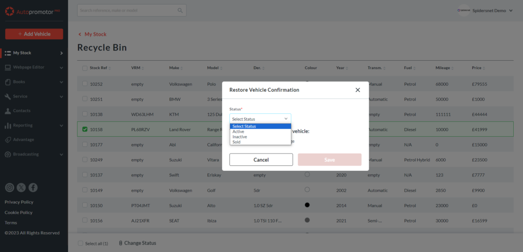 3 – You can then restore a deleted vehicle by selecting the desired vehicle, select ‘Change Status’ at the bottom of the page, select the desired status from the drop down options.