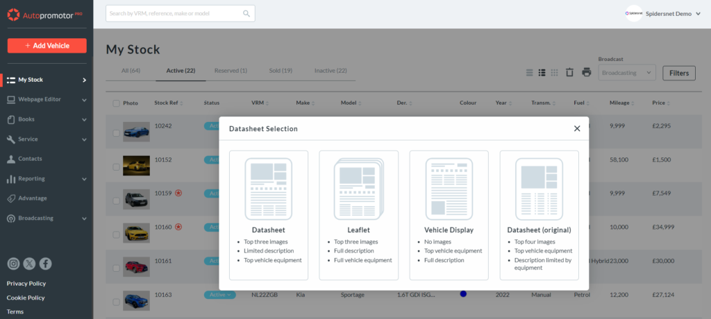 Autopromotor allows you to download four different types of data sheet for your individual vehicles. The four different layouts are designed to allow you to decide which information you want to include on your data sheet.