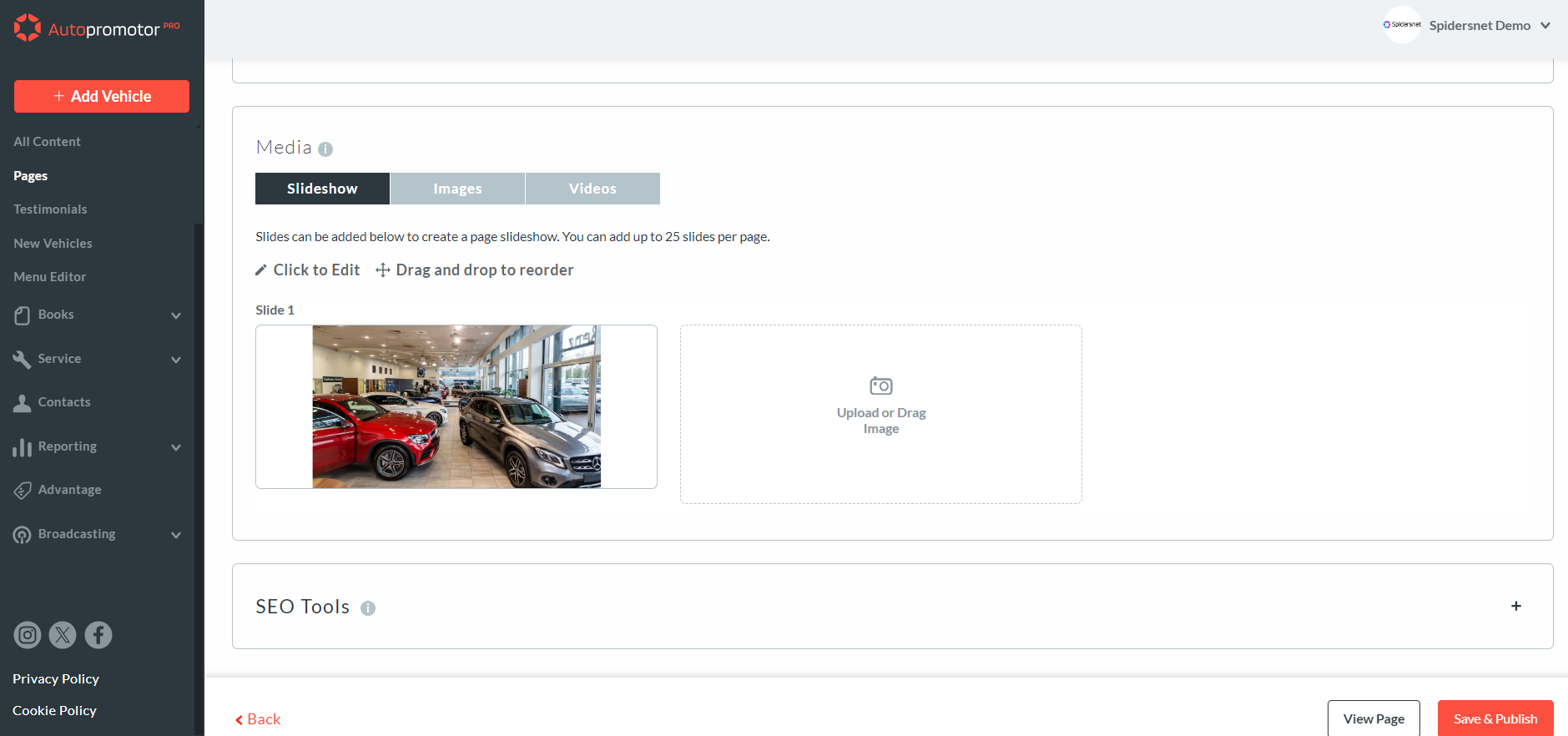 - The slideshow can feature images to show updates, opening times, deals & offers surrounding your dealership