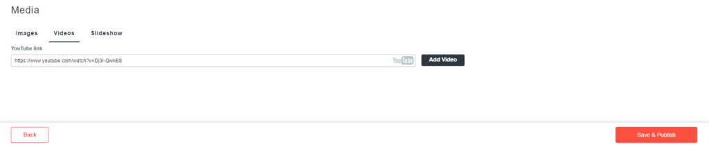 Videos work using a Youtube URL. You will need to upload your video to Youtube first to get the URL. Simply paste the Youtube link into the box and click on ‘Add Video’. The video will then appear beneath.