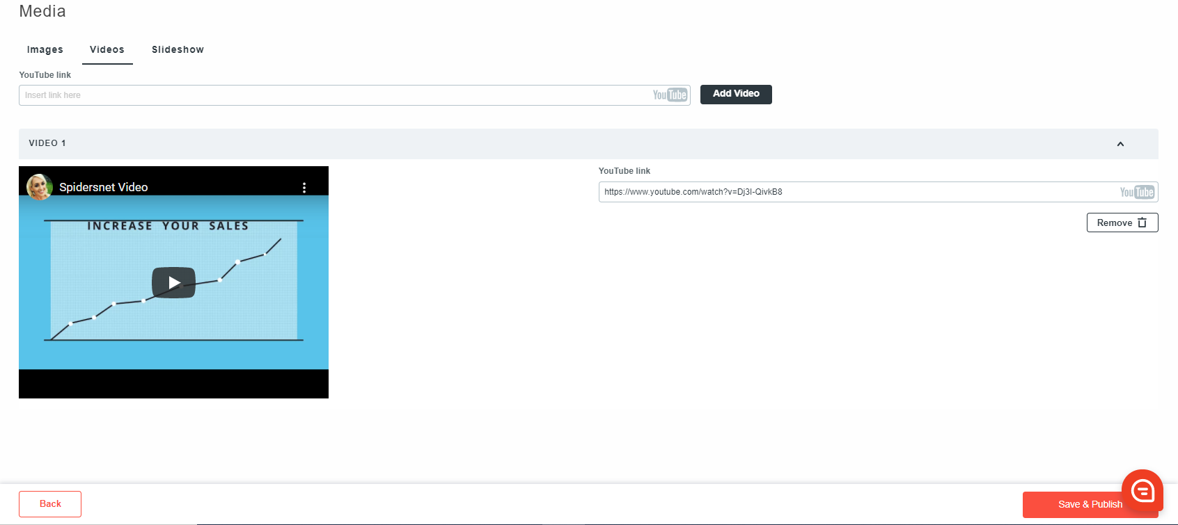 Videos work using a Youtube URL. You will need to upload your video to Youtube first to get the URL. Simply paste the Youtube link into the box and click on ‘Add Video’. The video will then appear beneath.