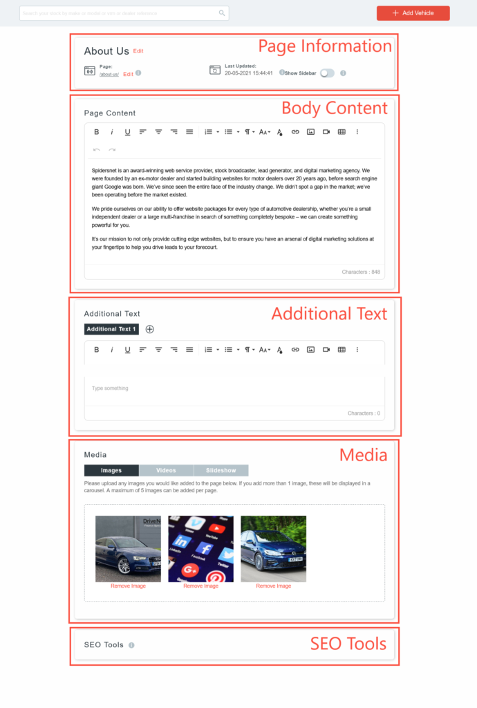 Once you have selected the page you wish to edit you are presented with the Page Editor. The Page Editor consists of 3 distinct sections: